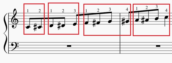 このように、半音階の場合、白鍵だけでなく、黒鍵も含むので、若干指使いが複雑になりますが、しっかりと練習しましょう。